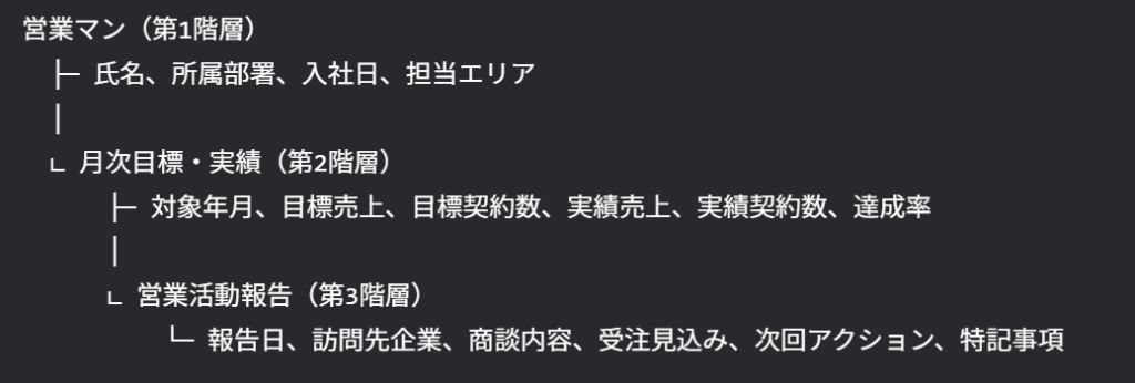 ユーザー(音声入力):「営業マンごとに毎月の目標と実績を管理したいです。営業マン別に月次の目標売上と契約数を設定し、月ごとの実績売上を記録します。さらに各月の営業活動報告や商談の進捗も記録できるようにしてください。」