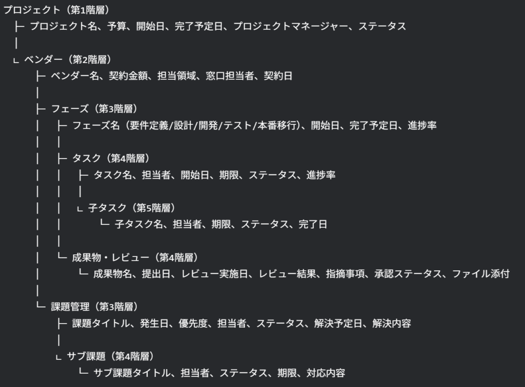 ユーザー(音声入力):「自社で発注するDXプロジェクトを管理したいです。プロジェクトごとに複数のベンダーが参画し、各ベンダーには複数のフェーズがあり、各フェーズにはタスクと成果物のレビュー記録が必要です。また、課題管理も行いたいです。」
